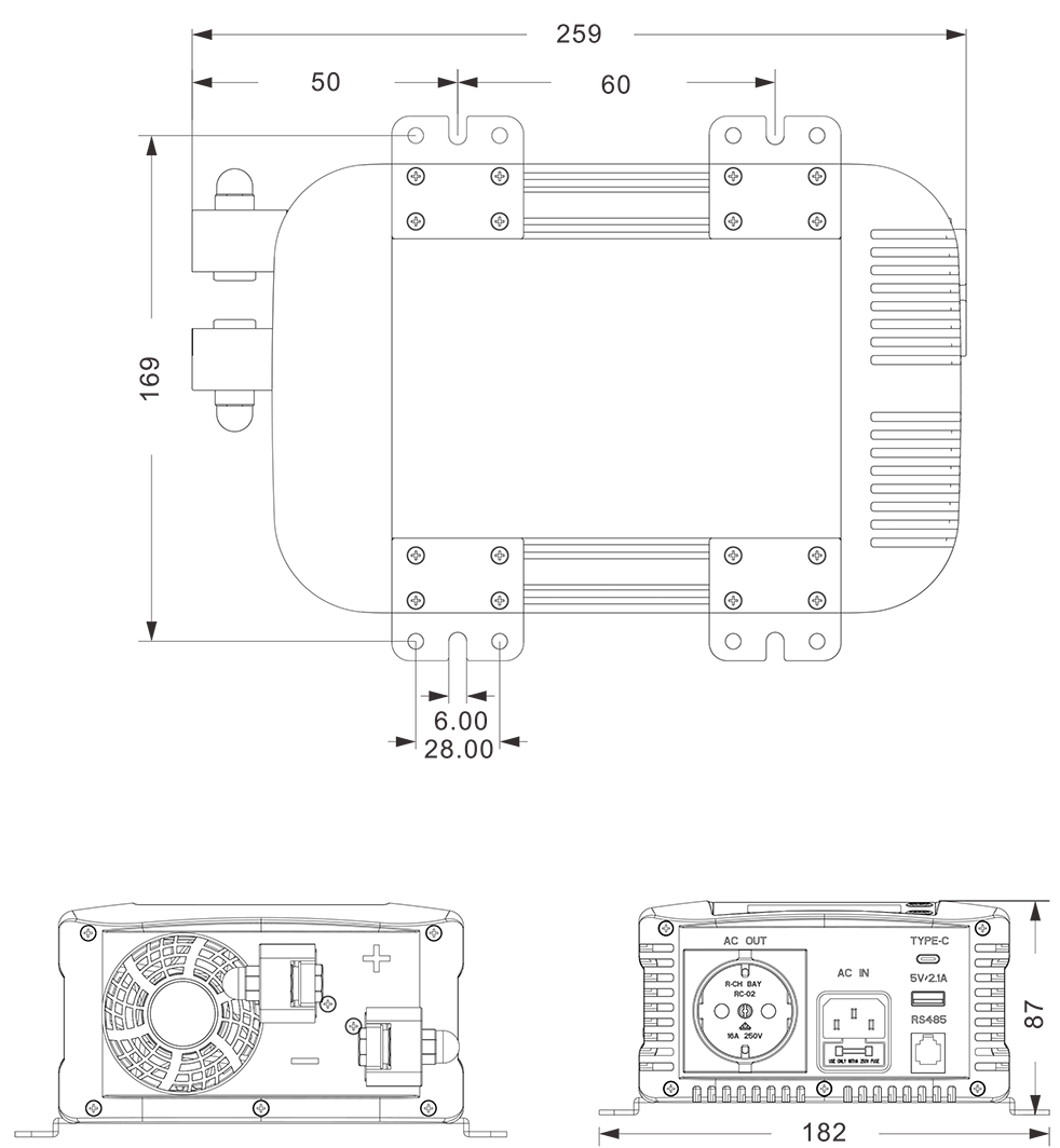 Mga guhit ng mekanikal: (259x182x87mm)