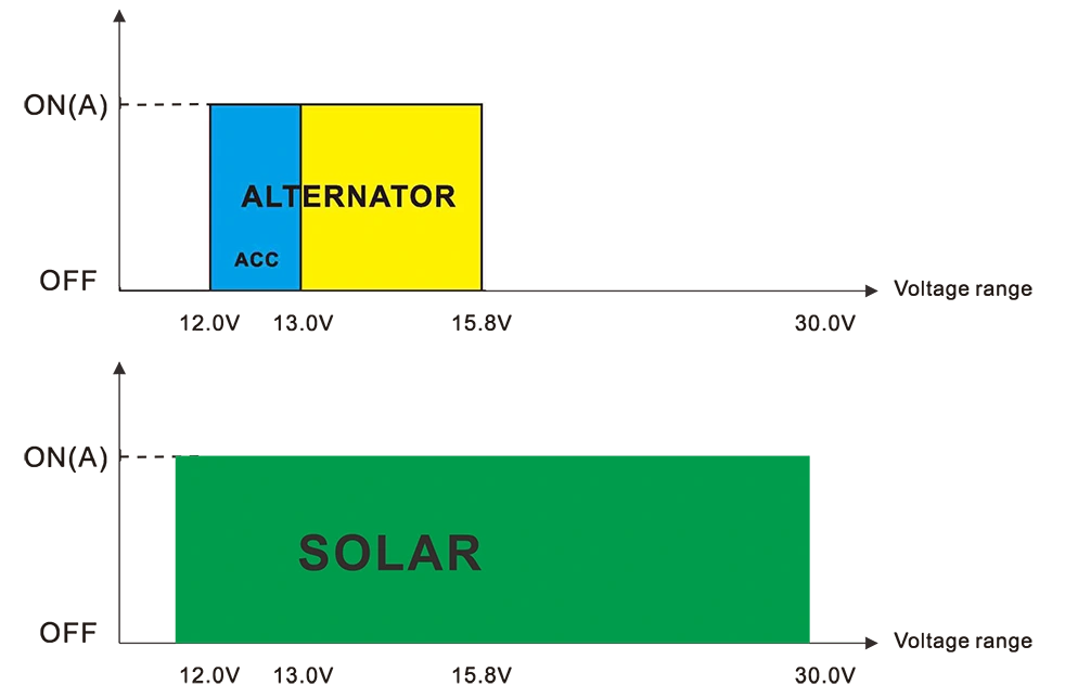 ● Universal AC input 12.0V-30.0V 士 0.2V para sa solar/12.0V-15.BVH0.2V para sa CAR